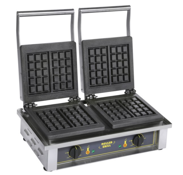Features: 2 on/ off switches, 2 thermostats 0 – 300°C, pilot lights, Brussels moulds (3 x 5 squares),