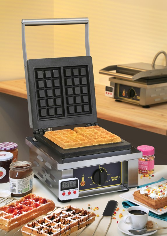 Features: on/ off switch, thermostat 0 – 300°C, pilot lights, Brussels mould (3 x 5 squares)